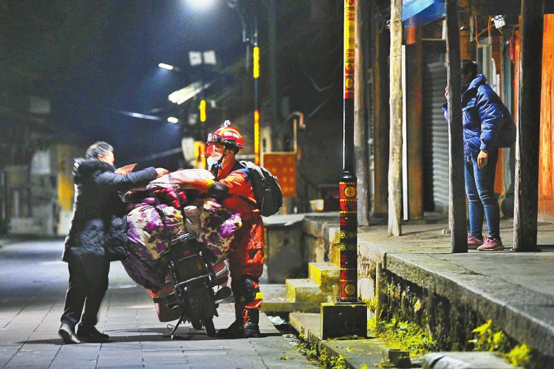 在燕子溝鎮(zhèn)新興老街,搜救排查發(fā)現(xiàn)一戶群眾房屋存在危險(xiǎn),消防隊(duì)員馬上幫助住戶收拾棉被和衣物,將其轉(zhuǎn)移到安置點(diǎn)。