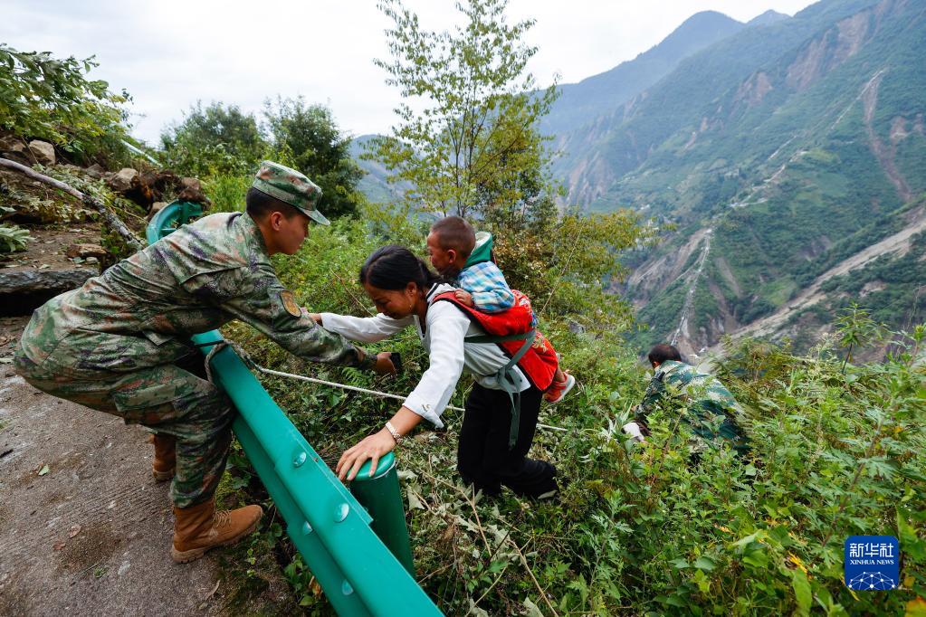 9月6日,救援人員幫助瀘定縣得妥鎮(zhèn)灣東村村民攀爬高山向外疏散。新華社記者 沈伯韓 攝