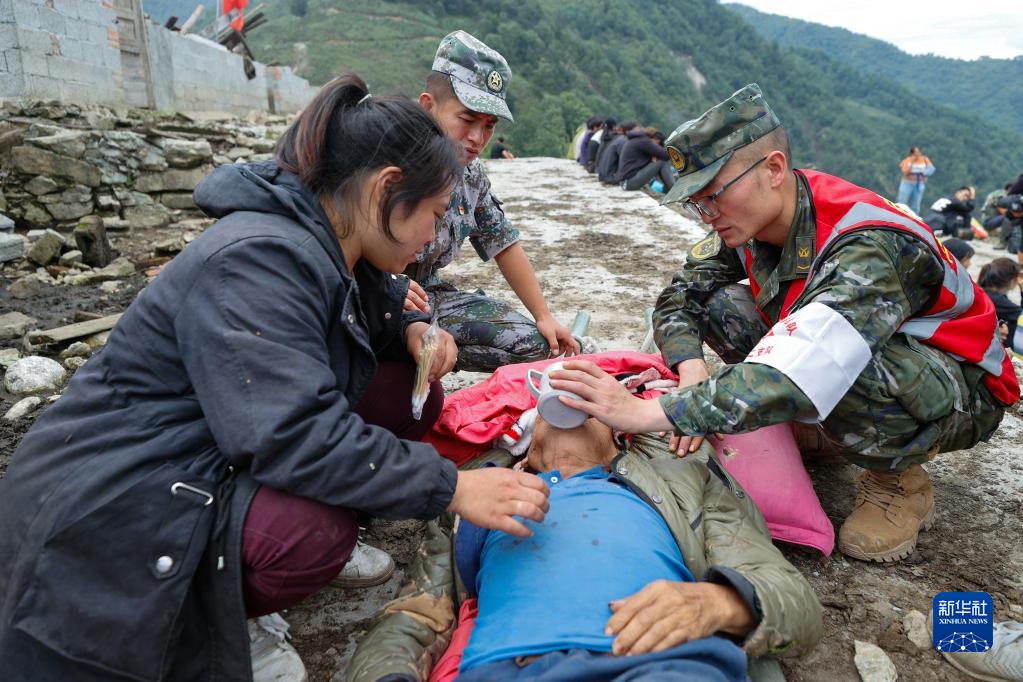 9月6日,救援人員給一名從瀘定縣得妥鎮(zhèn)灣東村疏散出來(lái)的受傷村民喂水。新華社記者 沈伯韓 攝
