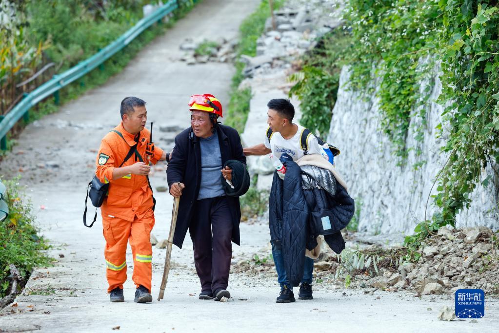 9月6日,救援人員護(hù)送從瀘定縣得妥鎮(zhèn)灣東村疏散出來(lái)的村民。新華社記者 沈伯韓 攝