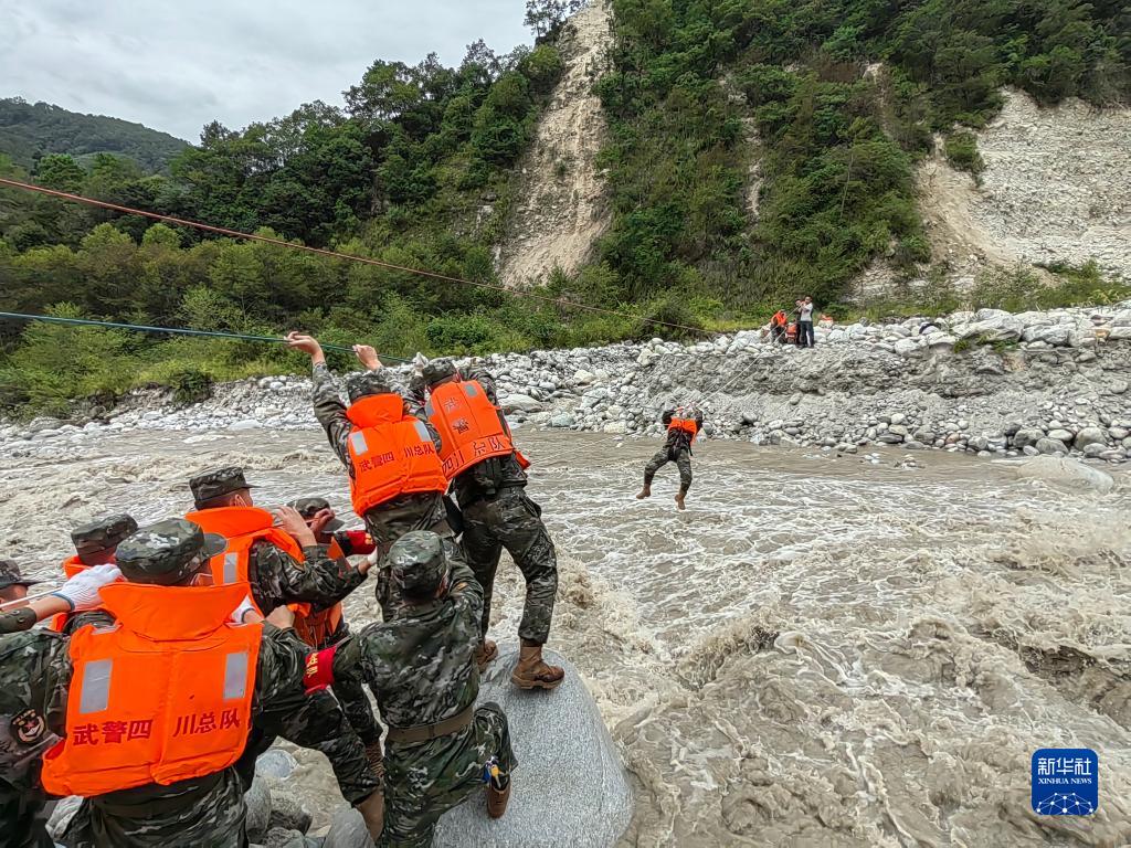 9月6日,武警四川總隊(duì)甘孜支隊(duì)救援官兵在瀘定縣磨西鎮(zhèn)通過繩索前往河對(duì)岸,救助被困群眾。新華社發(fā)(張文軒 攝)