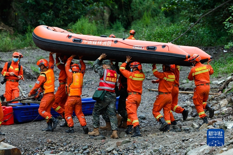 9月6日,救援隊伍正在合力將橡皮艇運往河邊,從水路繞過損毀道路。新華社記者 沈伯韓 攝