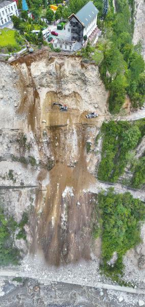 距磨西鎮(zhèn)1公里處的斷道點(diǎn),7.5米寬的公路路面,只剩下不到一半。剩余的路面呈懸空狀態(tài),下面是300米深的崖谷。受損如此嚴(yán)重,這段公路短期內(nèi)無法原路修復(fù),須另修一條便道,避開斷道點(diǎn)。