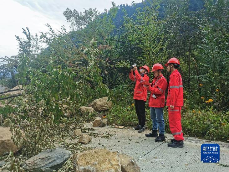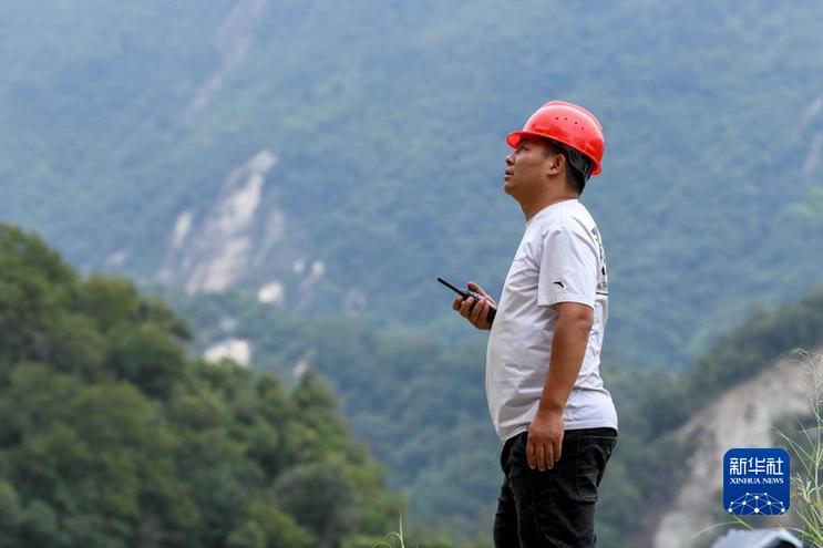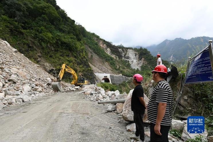 9月8日,王繼剛在幫清理道路落石的隊(duì)員觀察山上落石。新華社記者 胥冰潔 攝