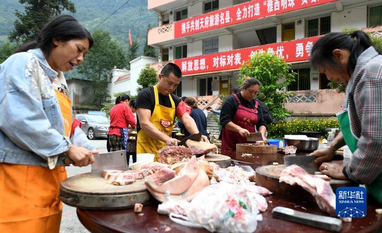 9月7日,在石棉縣草科鄉(xiāng)政府,李有琴(左一)與鄉(xiāng)親一起備菜。新華社記者 胥冰潔 攝