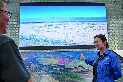 龍羊峽水光互補(bǔ)發(fā)電站的講解員楊若怡向來(lái)賓介紹當(dāng)?shù)厣鷳B(tài)逐漸向好的過(guò)程。