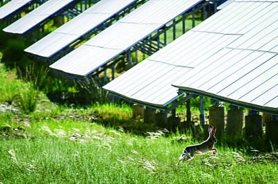 一只野兔在光伏板之間跳躍而過(guò)。生態(tài)改善后,園區(qū)吸引了許多野生動(dòng)物棲息。