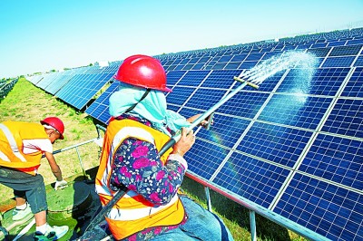 光電園區(qū)的工作人員正在清洗光伏板。