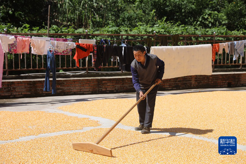 9月10日,在四川石棉縣王崗坪彝族藏族鄉(xiāng)挖角村,村民謝欽明在院子里曬玉米。新華社記者 劉瓊 攝