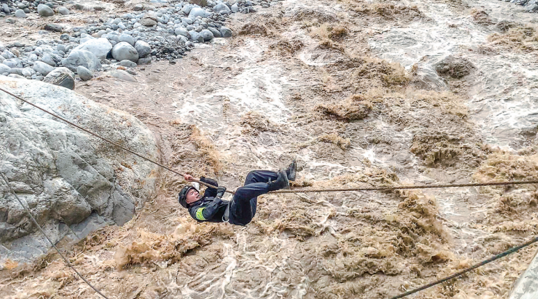 焦慮之際,另一組隊員沿河搜尋發(fā)現(xiàn)一塊離河對岸較近的巨石,率先過河的戰(zhàn)友打錨點接應(yīng),很快在兩邊架起一座“飛索橋”,曾經(jīng)當(dāng)過高山向?qū)У耐跞f銳第一個沖上去,四肢倒掛,背對激流,飛快移向?qū)Π?。緊接著,隊員沙馬澤呷躍上飛索。鋼索和飛索兩路同時過河,隊伍很快全部來到對岸。