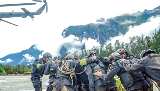 “9·5”地震發(fā)生前兩周,特警支隊舉行了一次警務(wù)技能大比武。比武科目包括高海拔山地武裝奔襲、簡易擔(dān)架制作、傷員應(yīng)急處理、傷員轉(zhuǎn)運、結(jié)繩……兩周后,他們來到另一個比武場,這一次是與死神較量。