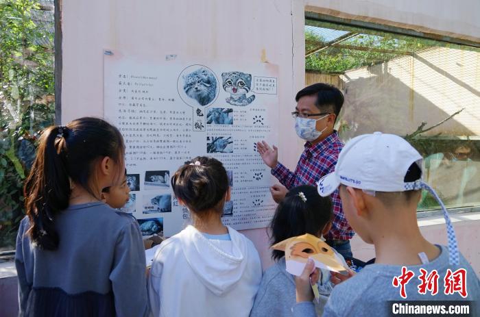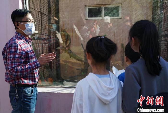 圖為青海野生動物救護繁育中心副主任向?qū)W生介紹荒漠貓。馬銘言 攝