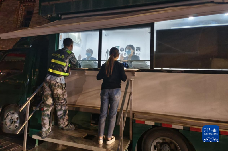 地震后第二天,郵政流動服務(wù)車駛進(jìn)震中磨西鎮(zhèn)服務(wù)群眾。(四川郵政供圖)