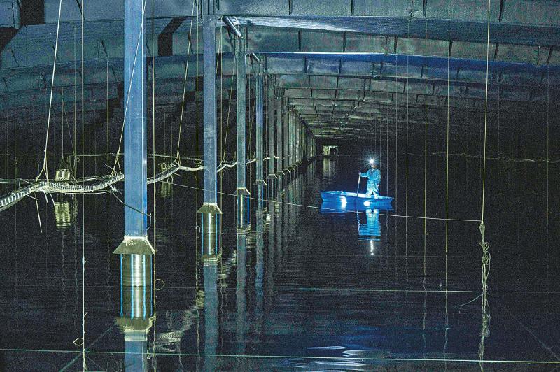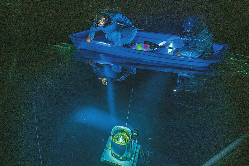 24日,陳明君和同事穿上潔凈服、戴上腳套,劃著小船進(jìn)入伸手不見五指的三號(hào)水池,他們要逐一檢查維護(hù)這里的探測(cè)器單元和電子學(xué)箱。船劃到指定位置,黑暗中陳明君的頭燈光束直射水底,水下碩大的探測(cè)器單元核心設(shè)備——光電倍增管,被照得清晰可見,他和同事一起用“鉤子”把光電倍增管拉起,進(jìn)行檢查?!八乩锏纳疃仁?.5米,這些純凈水的透明度比自來水高三倍以上,切倫科夫光就從里面捕獲。”陳明君告訴記者。