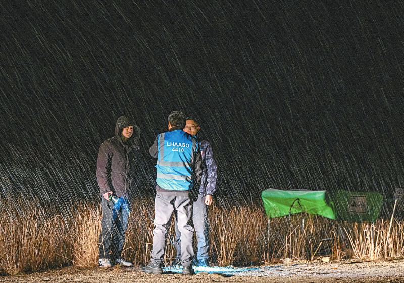 10月24日晚,拉索迎來了今秋的第一場(chǎng)大雪,走出水切倫科夫探測(cè)器的陳明君(中)與團(tuán)隊(duì)工作人員討論需要解決的問題。