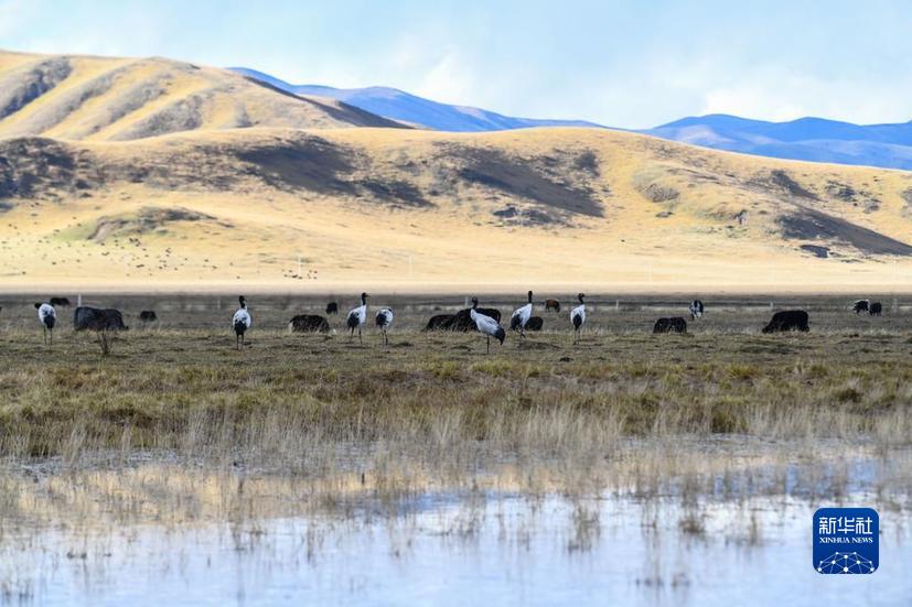 一群國家一級保護(hù)動(dòng)物黑頸鶴在四川省阿壩藏族羌族自治州若爾蓋縣的濕地活動(dòng)(2022年10月17日攝)。新華社記者 王曦 攝