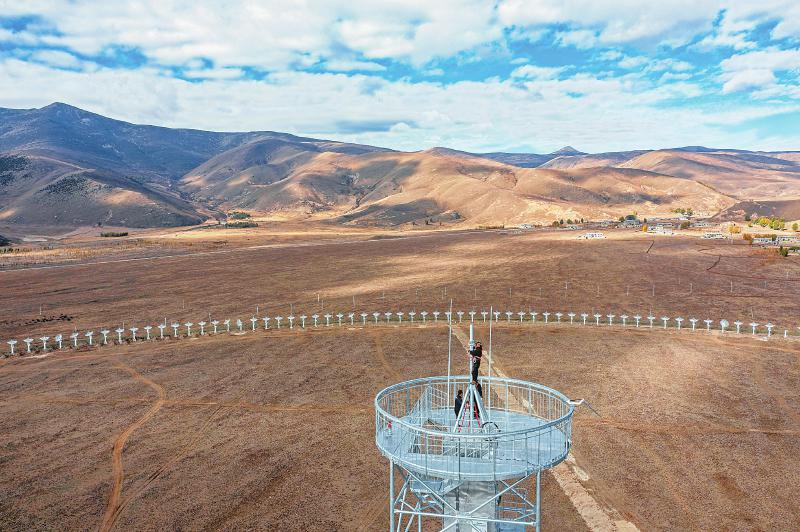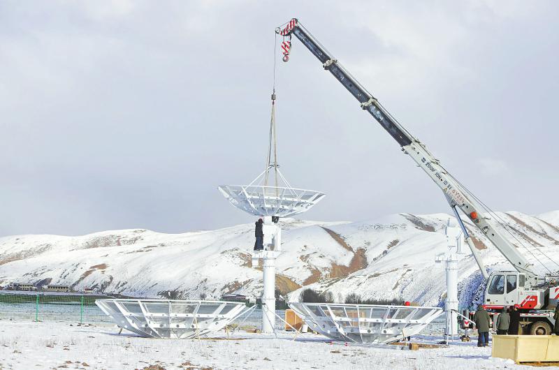 2022年11月13日 工人正在安裝圓環(huán)陣太陽射電成像望遠鏡設(shè)備的最后一個天線面。