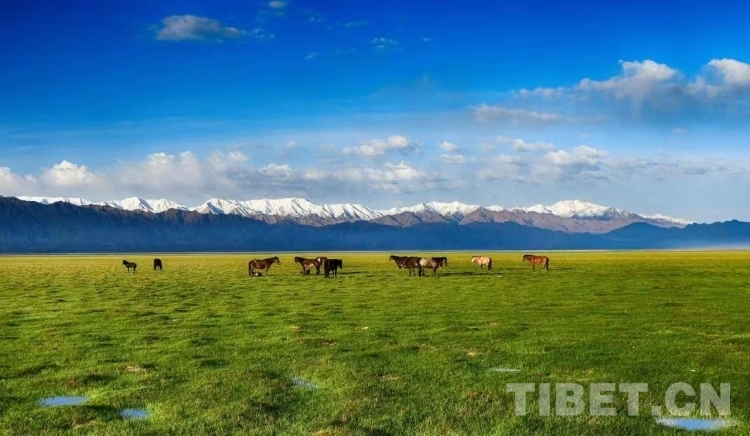 圖為藍(lán)天白云雪山掩映下的烏蘭草原