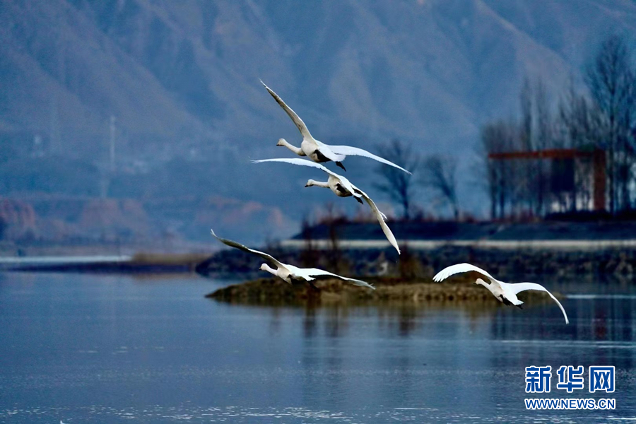 四只大天鵝飛過(guò)水面。新華網(wǎng)發(fā)(李玉峰 攝)