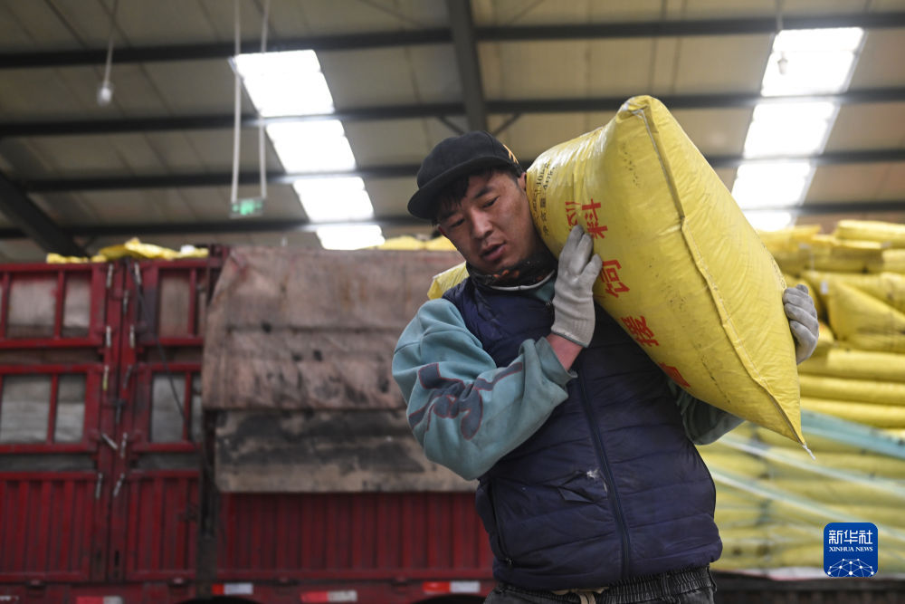 1月12日,青海省剛察縣一家飼料生產(chǎn)企業(yè),工作人員在搬運(yùn)成品飼料。新華社記者 張龍 攝