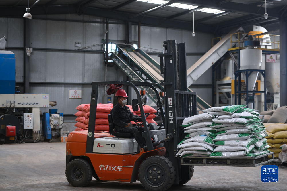 1月12日,青海省剛察縣一家飼料生產(chǎn)企業(yè),工人使用叉車(chē)搬運(yùn)成品飼料。新華社記者 張龍 攝