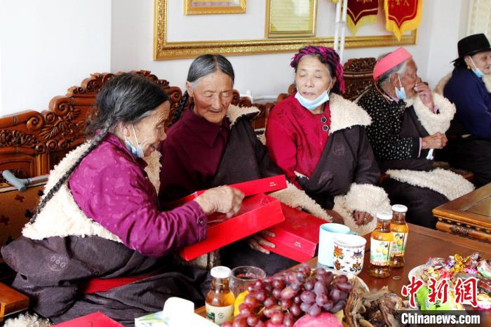 圖為同仁市社會(huì)福利服務(wù)中心的老年人拆開自己的新春禮物。馬芝芬 攝