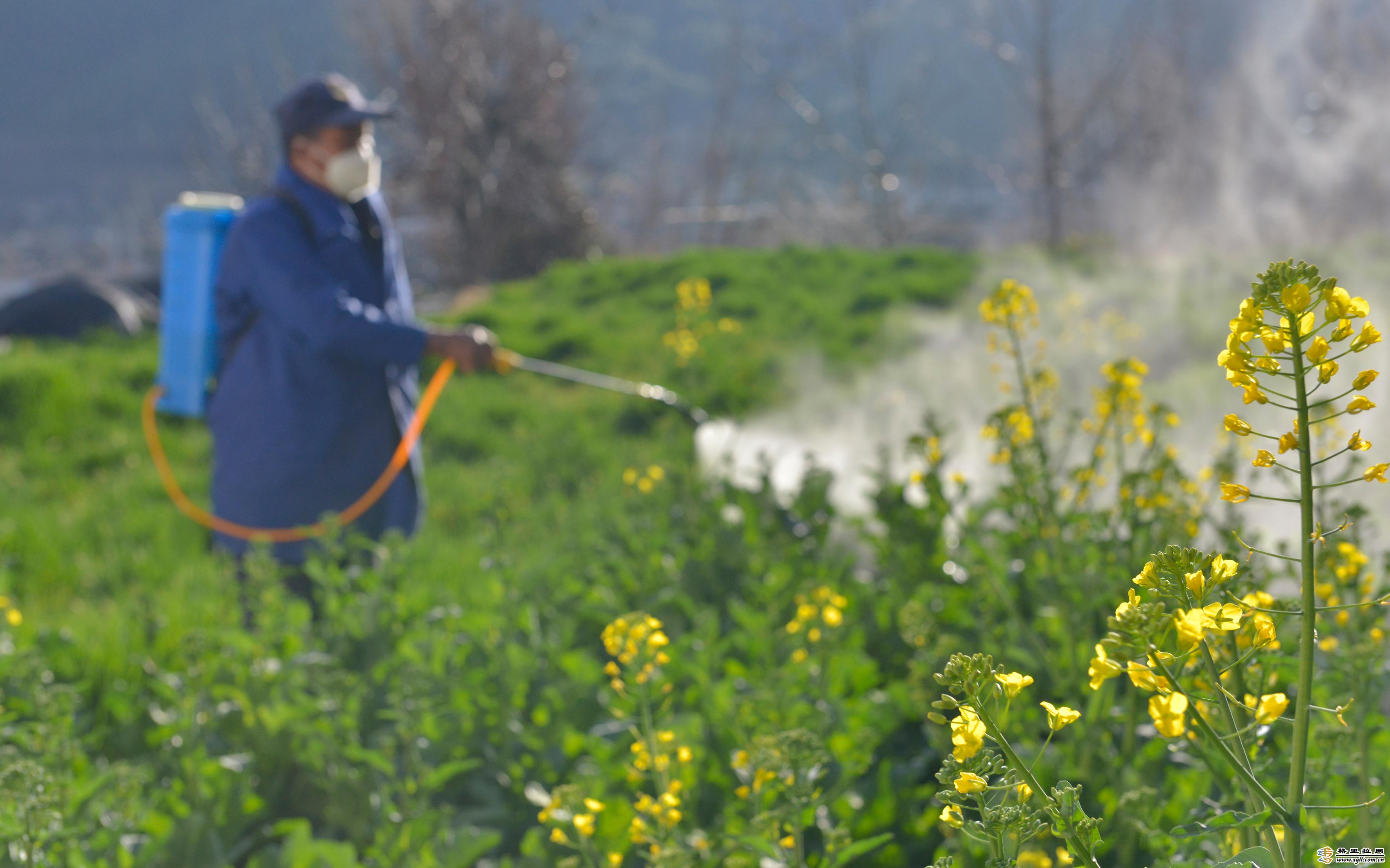 各地農(nóng)民搶抓農(nóng)時進(jìn)行田間管理,圖為香格里拉市金江鎮(zhèn)吾竹村格瓦組村民和麗光在油菜地里噴灑農(nóng)藥。