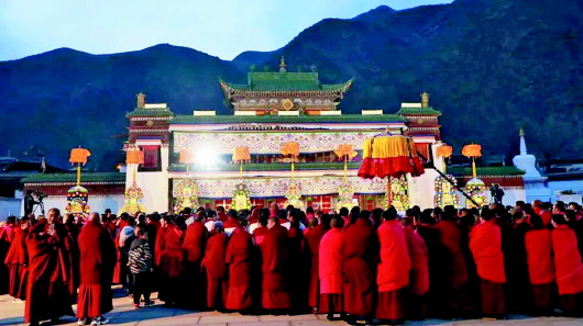 2月5日晚,夏河拉卜楞寺院內(nèi)法號(hào)長鳴、人山人海,正月十五酥油花展如期舉行。
