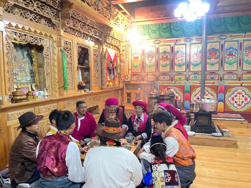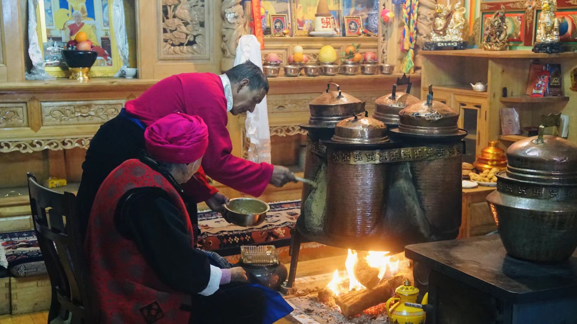 傍晚時(shí)分,“年夜飯”準(zhǔn)備完成,初稱站在火塘邊把剛和好的稀泥一層一層地刷到火塘上,“這是藏歷新年的添新土儀式(藏歷新年接福習(xí)俗),表示我們對(duì)來年日子風(fēng)調(diào)雨順、紅紅火火的美好期待?!背醴Q把這些傳統(tǒng)習(xí)俗認(rèn)真地教給家里的孩子們。