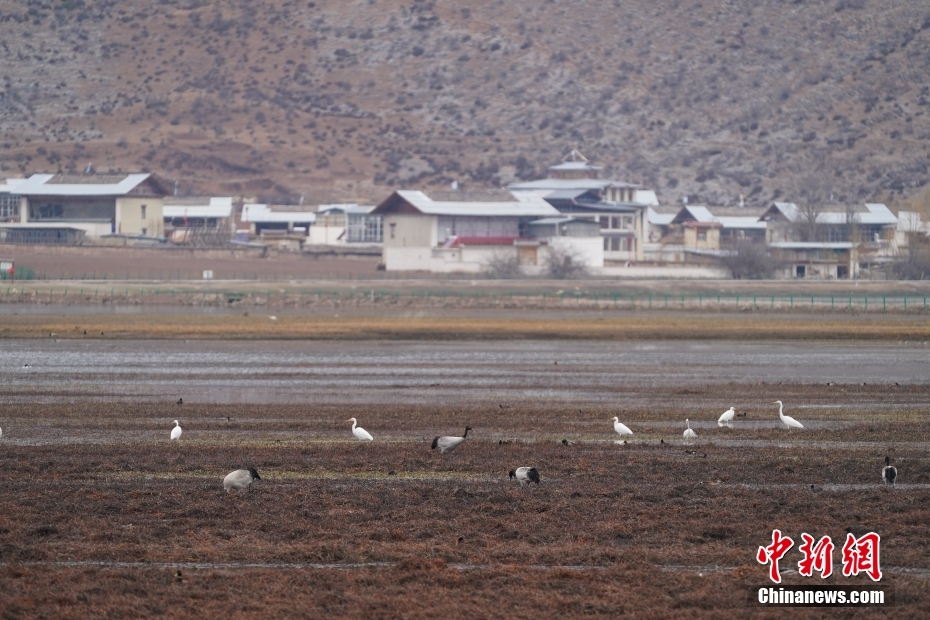 2月21日,覓食的候鳥與納帕海遠(yuǎn)處的村莊相映成趣。中新社記者 劉冉陽(yáng) 攝