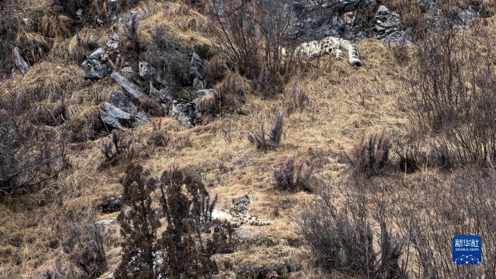 2月21日,在青海省玉樹(shù)藏族自治州雜多縣昂賽鄉(xiāng)境內(nèi)的昂賽大峽谷內(nèi),兩只雪豹正在休息。新華社記者 費(fèi)茂華 攝