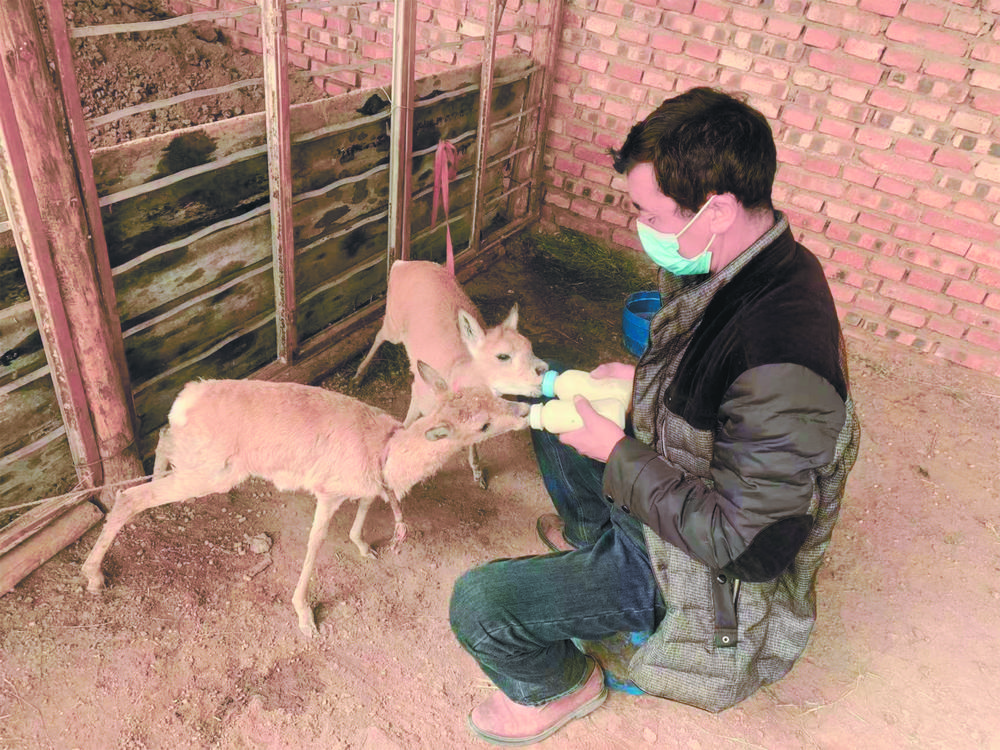 哈爾蓋鎮(zhèn)牧民在喂養(yǎng)救助的小普氏原羚。
