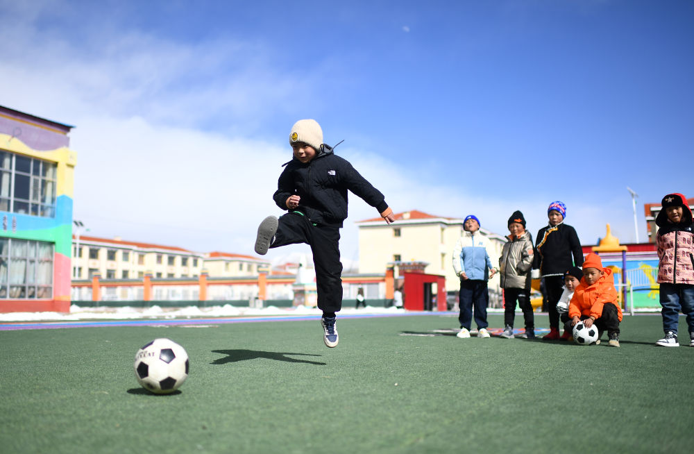 3月1日,在玉樹州治多縣,城南幼兒園小朋友桑周尼瑪(前)在練習(xí)射門。新華社記者 張宏祥 攝
