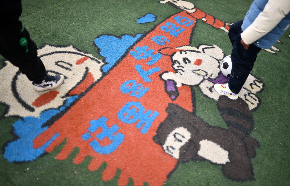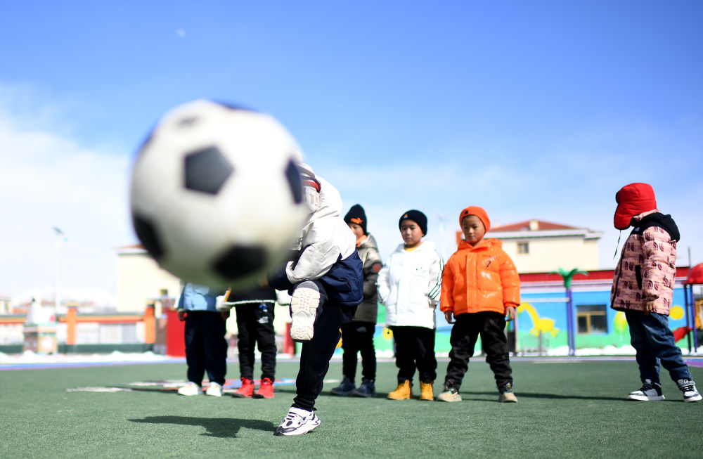 3月1日,在玉樹州治多縣,城南幼兒園小朋友旦增然桑(左一)在練習(xí)射門。新華社記者 張宏祥 攝