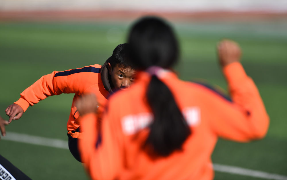 3月1日,在玉樹州曲麻萊縣第一完全小學(xué),曲麻萊青訓(xùn)隊(duì)球員白瑪加(后)在訓(xùn)練課中。新華社記者 張宏祥 攝