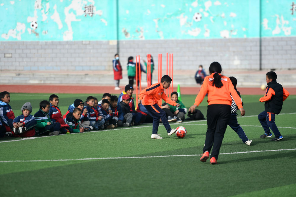 3月1日,在玉樹州曲麻萊縣第一完全小學(xué),曲麻萊青訓(xùn)隊(duì)球員在訓(xùn)練課上。新華社記者 張宏祥 攝