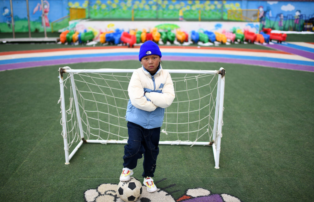 3月1日,在玉樹州治多縣,城南幼兒園小朋友羅松伊西在幼兒園的球場(chǎng)上。新華社記者 張宏祥 攝