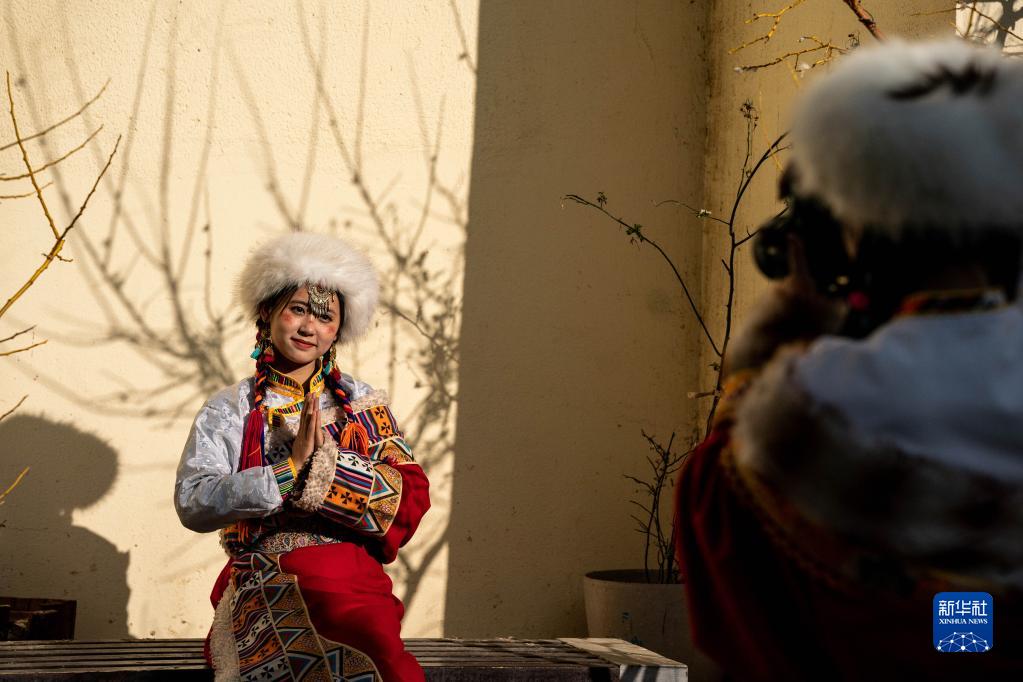 3月8日,游人在獨克宗古城拍照留念。新華社記者 胡超 攝