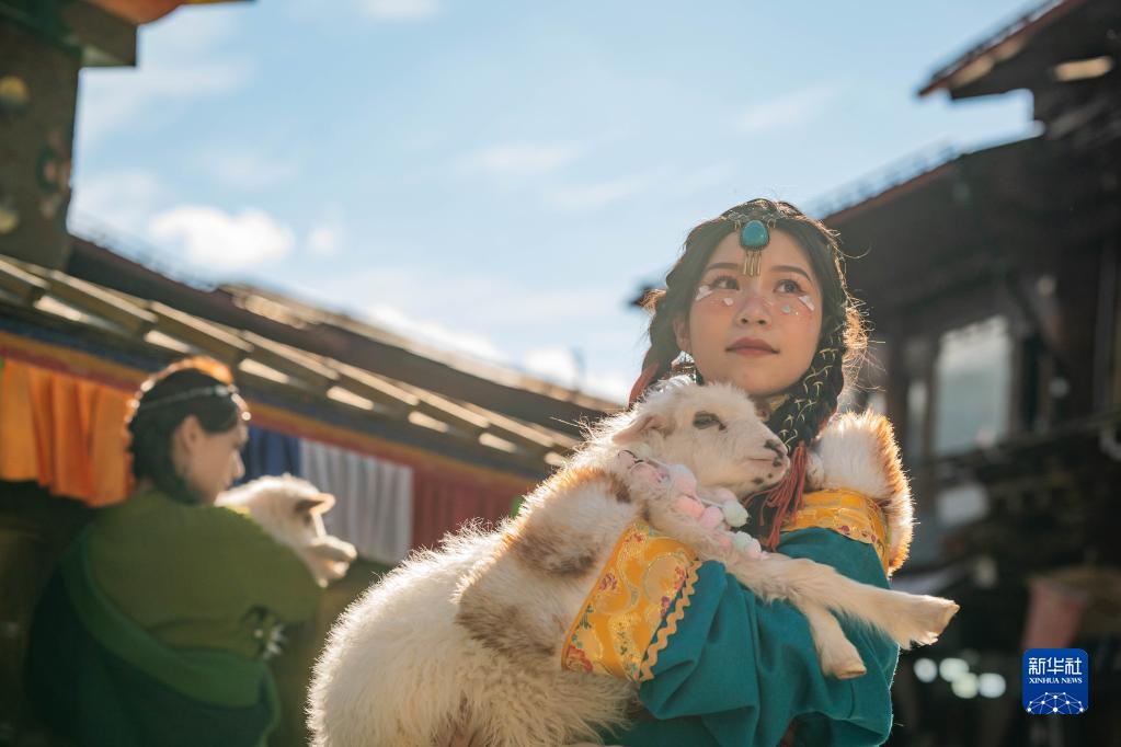 3月8日,游人在獨克宗古城里抱著小羊拍照留念。新華社記者 胡超 攝
