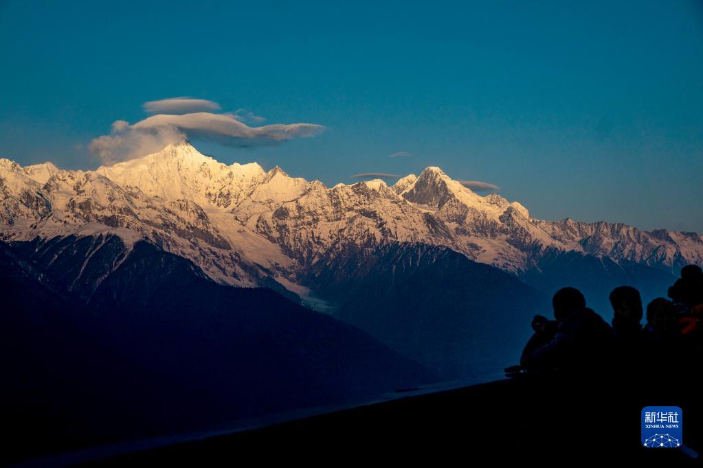3月10日,游人在觀賞梅里雪山“日照金山”景觀。新華社記者 胡超 攝