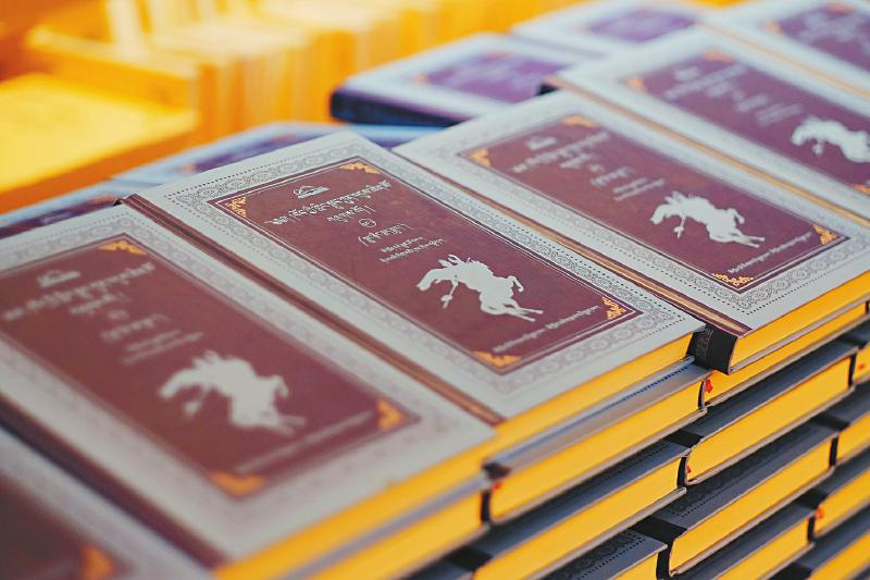 《格薩爾王全集》的裝幀,封面是比較特別的,有云紋做背景,書的背脊,一邊是書名和編號,另一邊是由十余幅格薩爾唐卡拼接而成,書頁上端的空白和紙邊之間采用了金色滾邊的工藝。[詳細] -