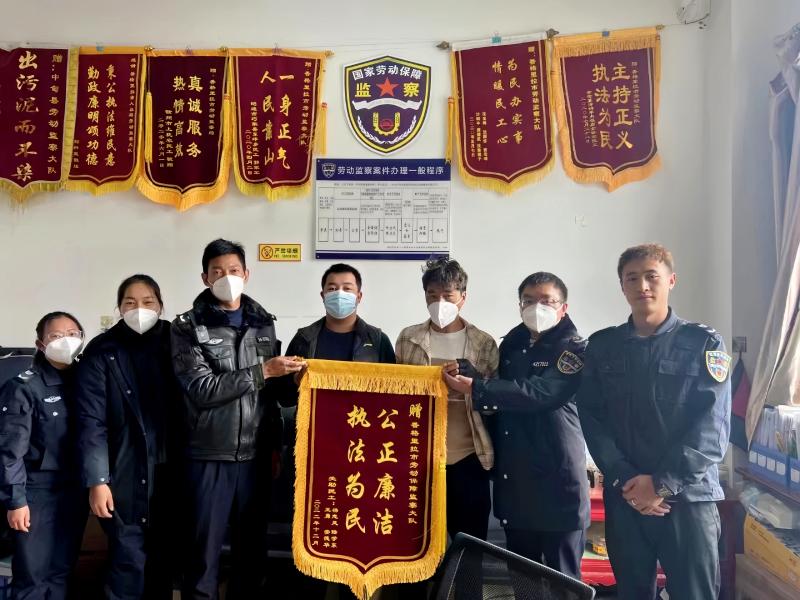 2022年12月,楊應(yīng)中所在的香格里拉市人社局勞動監(jiān)察大隊收到某建筑工程有限公司拖欠農(nóng)民工工資22000元的情況反映,楊應(yīng)中和監(jiān)察人員迅速開展調(diào)查工作,經(jīng)過一系列的調(diào)查處理,被拖欠的工資全部打入農(nóng)民工賬戶,妥善有效地化解了欠薪隱患。事后,6名涉事農(nóng)民工將一面印有“討薪維權(quán)暖人心 排憂解難似親人”的錦旗送到該大隊,對勞動保障監(jiān)察人員追回其被拖欠工資表示感謝,由衷稱贊他們迅速反應(yīng)、高效處置的工作作風(fēng)。一面錦旗、一份責(zé)任,錦旗不僅承載了群眾對勞動保障監(jiān)察工作的肯定,更承載著勞動者對勞動監(jiān)察工作的信任和期盼。對楊應(yīng)中來說,用心用情為民服務(wù)是每天的工作日常,群眾的認可更加堅定他的初心使命,他說:“在今后的工作中,一定繼續(xù)為勞動者解決‘急、難、愁、盼’問題,以實際行動切實保護好勞動者的合法權(quán)益。”