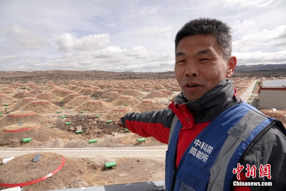 圖為國(guó)家驗(yàn)收之前的4月22日,四川稻城海子山,“拉索”總工藝師、中國(guó)科學(xué)院高能物理研究所研究員何會(huì)海介紹大科學(xué)裝置建設(shè)相關(guān)情況。中新社記者 孫自法 攝