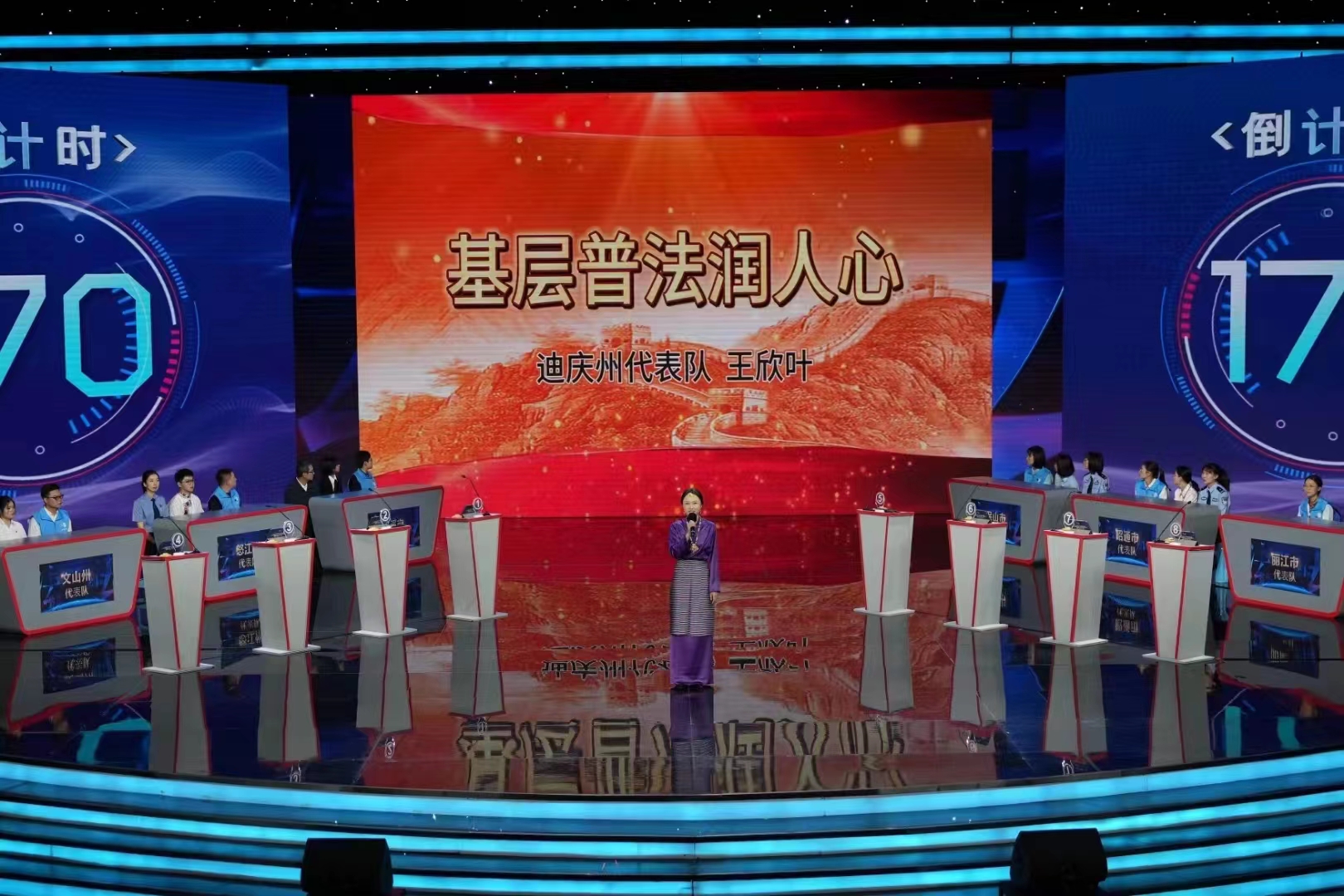 據(jù)悉,此次活動由云南省委宣傳部、省委政法委、省司法廳、省社科聯(lián)等11家單位主辦,將開展近300項重點活動,推進(jìn)法治宣傳進(jìn)農(nóng)村、進(jìn)社區(qū)、進(jìn)校園、進(jìn)機關(guān)、進(jìn)企業(yè)、進(jìn)軍營、進(jìn)網(wǎng)絡(luò)。此次“普法強基在行動·爭做法律明白人”全民學(xué)法大賽全省16個州市組隊參加,每支參賽隊由村(社區(qū))法律明白人、鄉(xiāng)鎮(zhèn)中小學(xué)教師、擔(dān)任鄉(xiāng)鎮(zhèn)中小學(xué)法治副校長的基層政法干警各1人組成。經(jīng)過各州市選拔賽和半決賽的激烈角逐,共決出8支隊伍進(jìn)入電視總決賽。決賽包含必答題、挑戰(zhàn)答題、兩隊對戰(zhàn)、風(fēng)險題、演講賽五個環(huán)節(jié)。
