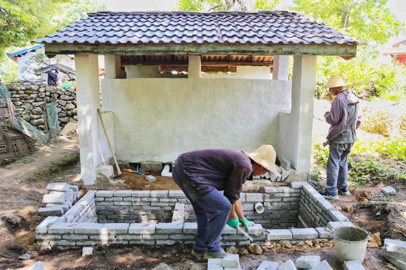 工人正在金江鎮(zhèn)吾竹村進行農(nóng)村三格式戶廁建設
