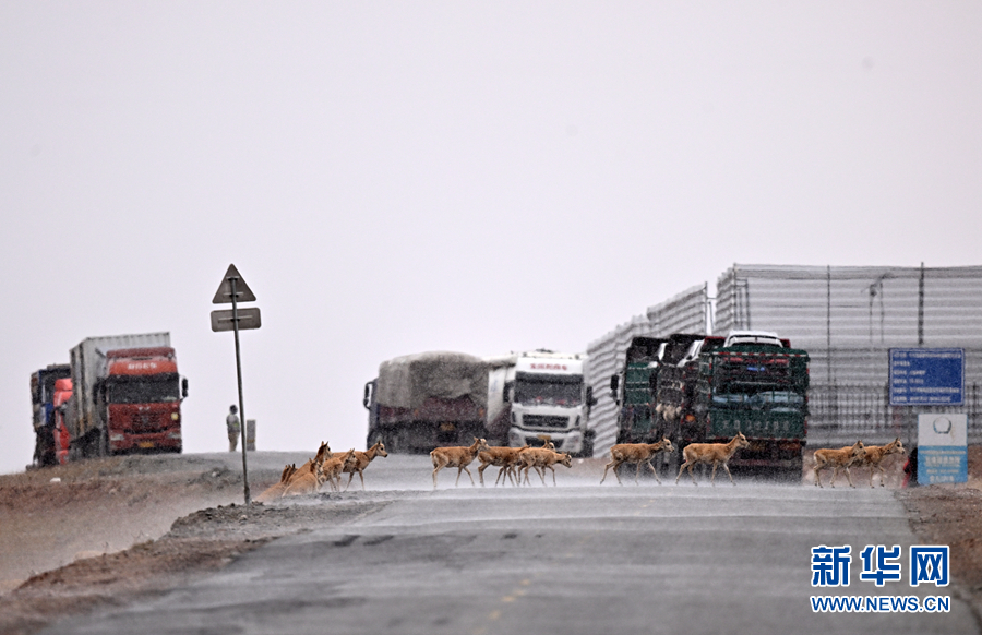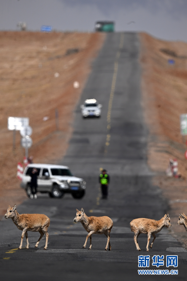 在青??煽晌骼铮蝗捍菩源a(chǎn)藏羚羊通過(guò)青藏公路。新華社記者 張宏祥 攝