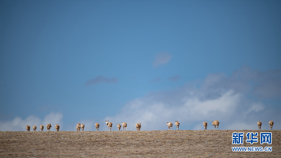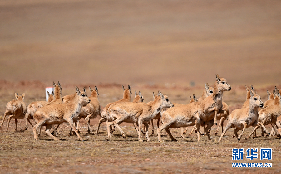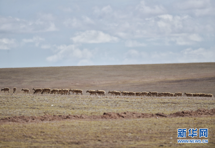 一群雌性待產(chǎn)藏羚羊在青海省玉樹(shù)藏族自治州境內(nèi)活動(dòng)。新華網(wǎng) 潘彬彬 攝