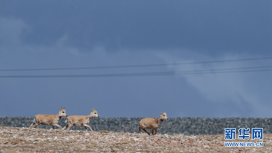 在青海省玉樹(shù)藏族自治州境內(nèi),一群藏羚羊準(zhǔn)備通過(guò)青藏鐵路。新華網(wǎng) 潘彬彬 攝