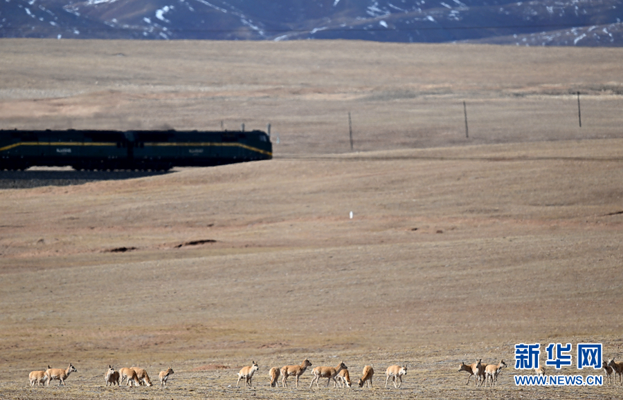 一群藏羚羊在青海省玉樹(shù)藏族自治州境內(nèi)的草原上活動(dòng),一列火車(chē)行駛在它們身后的青藏鐵路上。新華社記者 張宏祥 攝