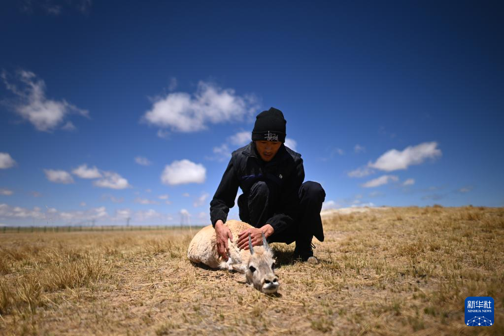 在可可西里國家級自然保護區(qū)索南達杰保護站,巡山隊員才文多杰在野生動物救助中心查看被救助的藏羚羊身體狀況(5月30日攝)?!⌒氯A社記者 張宏祥 攝